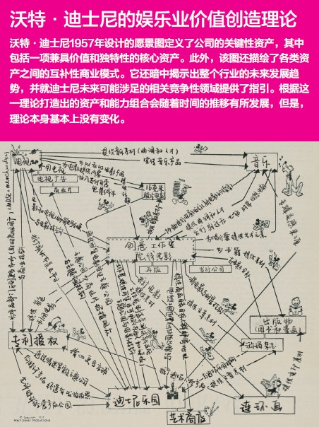 那些商海上的常胜将军通常都拥有一套连贯的价值创造理论。当继任者一旦丢失这一理论,这些公司往往会困境缠身。而所谓的东山再起往往意味着找回这些理论。沃特·迪士尼公司的历史就是一个最好的例子。对于如何创造价值,创始人有着一套非常清晰的理论,这幅图被收录在公司档案中,该文展示出其副本(参见图表“沃特·迪士尼的娱乐业价值创造理论”)。