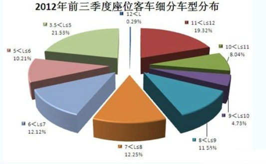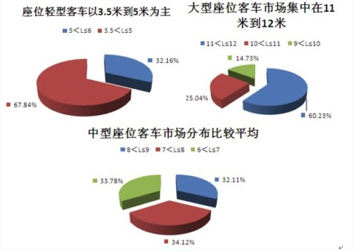将大中轻客车市场进一步细分,轻型与大型座位客车结构相似,各自有一种车型比重较大,其中3.5米到5米、11米到12米段的座位客车在整体座位客车中各自占了两成份额。