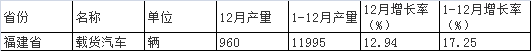 中商情报网数据显示,2012年1-12月福建省载货汽车产量为11995辆。