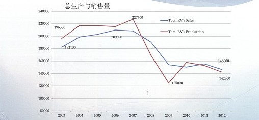 2012年,欧洲房车销量为146600辆,其中拖挂式房车74000辆,自行式房车72600辆;房车生产量142300量,其中拖挂式房车66000辆,自行式房车76300辆。