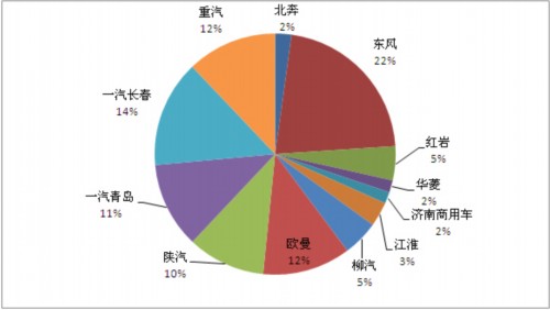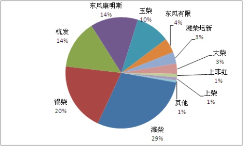 重卡配套动力方面,从2013年2月份的配套信息来看,配套前3的发动机企业分别是潍柴动力、锡柴和杭发,共占据重卡配套市场的63.25%;第四、五的发动机企业分别是东风康明斯和玉柴,前5家发动机企业占据重卡配套市场的91.17%;前10家发动机企业占据重卡配套市场的99.38%。由此可见,全国重卡发动机配套市场的行业集中度相对较高。