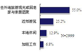 在参与此次调查的2999名被访者中,半数以上的节假日期间安排为:去外地旅游观光或回老家与亲朋团聚。此外,25.2%选择“近郊游览”,12.9%选择“本地休闲”。 (见图1)