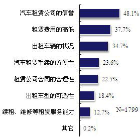 有租车意向的被访者,租车时最看重的因素是什么?“汽车租赁公司的信誉”、“租赁费用的高低”、“出租车辆的状况”等多项因素都为消费者所看重。