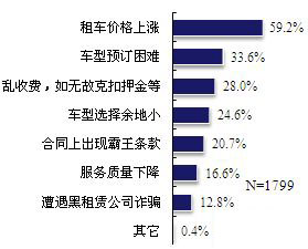 在节假日期间租车,由于消费需求比较集中,再加上目前国内的汽车租赁行业良莠不齐,往往所引发的纠纷也会随之增多。在有租车意向的被访者中都遭遇过哪些问题?