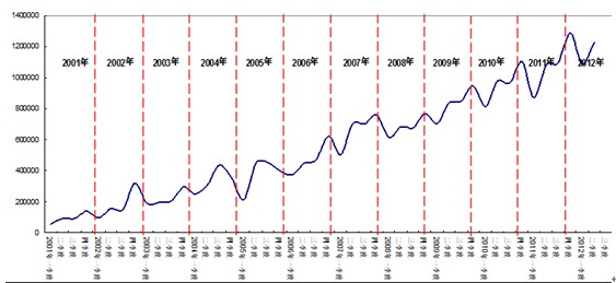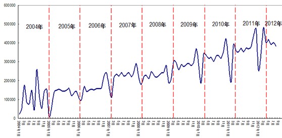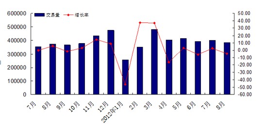 北京北辰亚运村汽车交易市场中心发布的数据显示,2012年8月,中国二手车市场交易量达38.38万辆,环比七月减少 4.56%。交易总额达192.26亿元,环比上月降低 6.84%。