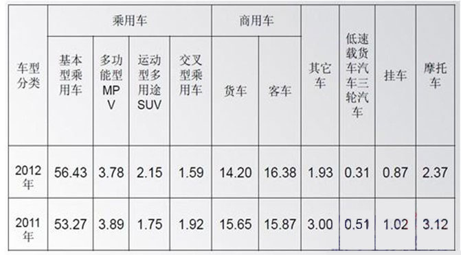 2011、2012年1-8月各车型占总交易量的份额表单位:%