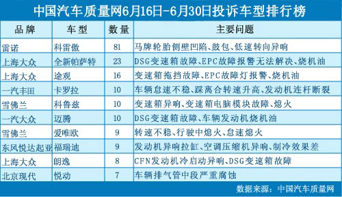 2012年6月16日~6月30日,中国汽车质量网接到消费者针对汽车产品的投诉总计508宗,相比6月上半月有所上升,共涉及129款车型。