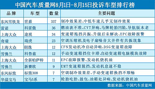 2012年8月1日~8月15日,中国汽车质量网接到消费者针对汽车产品的投诉总计774宗,共涉及127款车型,两项数据相比7月下半月均有所上升。