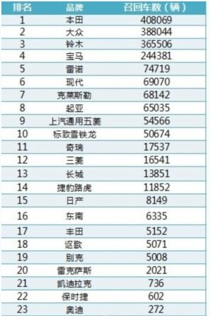 从2013年1月1日至今日,国家质量监督检验检疫总局(以下简称“国家质检总局”)共发布66条汽车召回通告,共召回1881557辆车,其中涉及20家汽车公司31个汽车品牌。召回最多的是本田408069辆、大众388044辆、铃木365506辆和宝马244381辆;从发布的召回信息来看,大众集团发布(包括奥迪、保时捷、兰博基尼、宾利)8条、现代起亚集团6条、丰田(包括雷克萨斯)6条、宝马5条。同时,发布的召回信息包括该品牌进口车型以及在华的合资车型。
