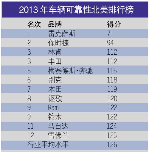 近日,全球性市场咨询公司J.D. Power and Associates发布了2013年美国汽车可靠性研究报告,丰田旗下的豪华品牌雷克萨斯再次蝉联冠军,并以每100辆汽车71个问题的评分创下了该评比的历史纪录。