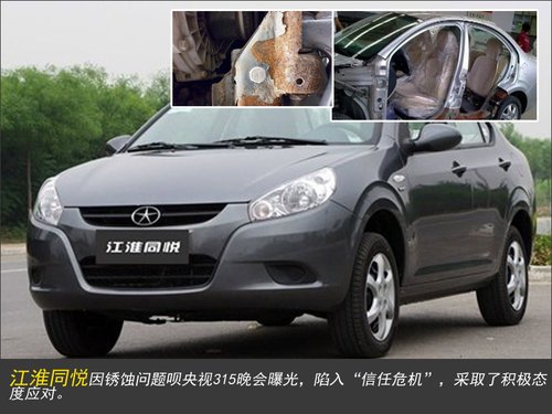 今年央视“3·15”晚会上,大家都很关注有哪些上市企业“中枪”,而这次江淮汽车被曝光车辆在使用1-2年后便开始大面积锈蚀。不过3月15日晚江淮汽车也积极应对,开始在网络、微博、论坛,包括自身官方网站首页宣布召回、主动寻找车辆锈蚀原因。