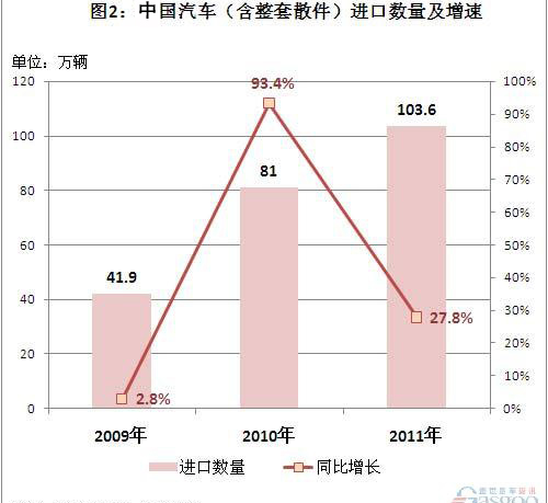 根据中国海关总署的数据,2010和2011年,中国汽车(含整套散件)进口量和金额都明显大增。