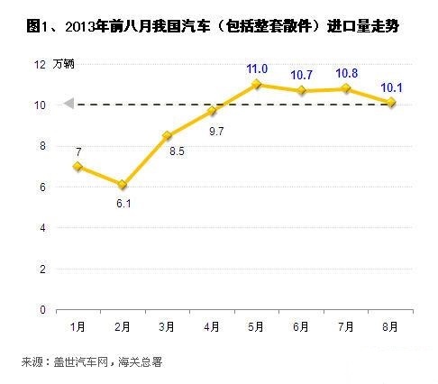在宏观经济的逐渐回暖,市场需求的回升以及进口车价格不断走低等因素影响下,近几月,我国汽车进口持续处于高位运行,进口量保持十万辆水平。根据海关总署数据,今年8月,我国汽车(含整套散件,下简称为汽车)进口量10.1万辆,已连续第4个月保持10万辆规模。