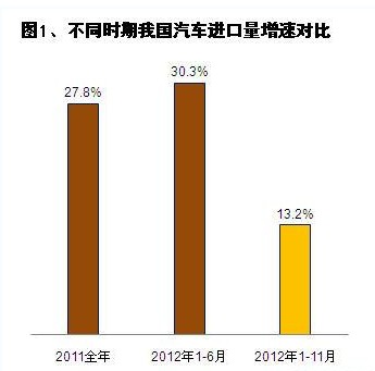 中国海关总署的数据显示,2012年1-11月,我国汽车(含整套散件,以下简称为汽车)进口量累计105.2万辆,已超过2011年全年的103.6万辆。与2011年1-11月相比,汽车进口量增长13.2%,增速明显高于国内车市平均水平(4.0%)。