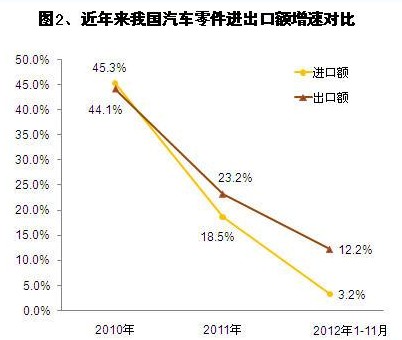 汽车零部件方面,2012年1-11月,汽车零部件进口额增速明显低于出口额增速:前者同比仅增3.2%,后者增速为12.2%。但与2010和2011年相比,其增速均有放缓之势。