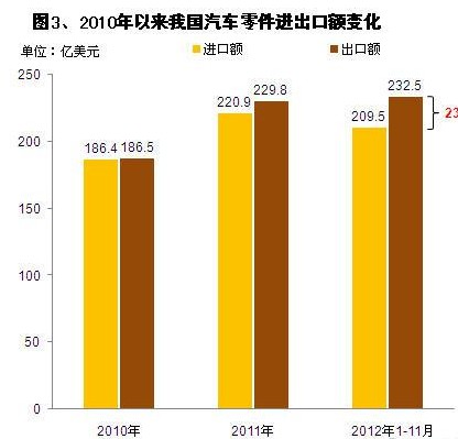 2010年,汽车零部件出口额仅比进口额高0.1亿美元,2011年贸易顺差增大至8.9亿美元。2012年1-11月,汽车零部件进口额为209.5亿美元,出口额为232.5亿美元,贸易顺差再度扩大,增至23亿美元。