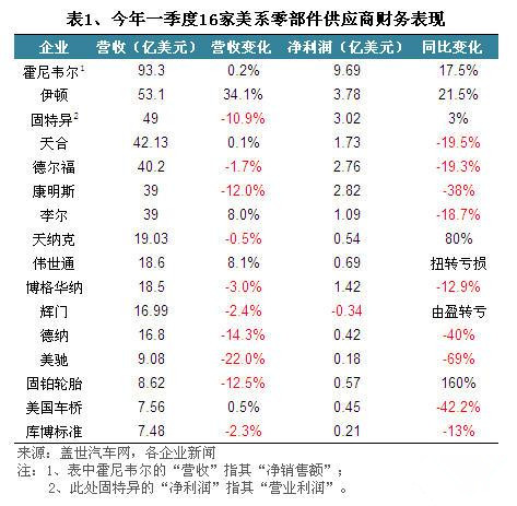 今年第一季度,全球较大的汽车零部件供应商中,美系企业多数财务表现不佳,营收/利润出现下滑。