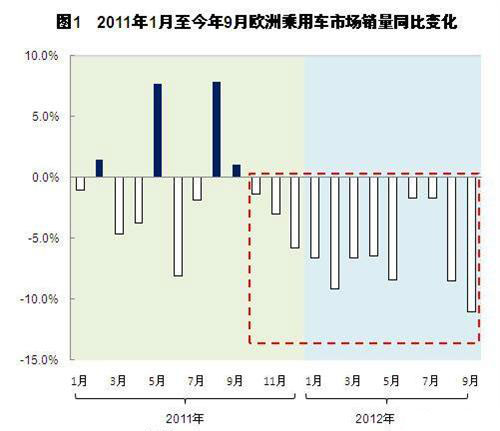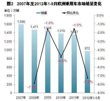 据统计,自2011年10月至今年9月,欧洲乘用车市场销量持续下滑,今年前三个季度,该地区乘用车市场累计销售汽车972.44万辆,同比下滑7.2%。实际上,欧洲乘用车市场的需求自2008年开始就已持续缩水,由2007年159.98万辆的销量持续下降至2011年的135.74万辆。