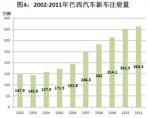 从2010年开始,巴西就已超越德国,成为全球第四大汽车市场。2011年,巴西汽车销量(指新车注册量)为363.3万辆,仅次于中国、美国和日本。