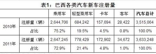 2011年,在巴西汽车总销量中,乘用车占72.9%,轻型商用车占21.4%,卡车占4.8%,客车占1%。