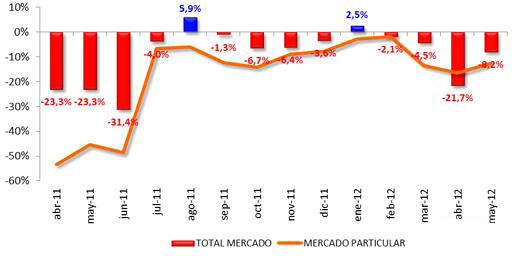 据西班牙汽车工业协会(ANFAC)统计的数据,5月西班牙汽车市场继续呈现疲软的趋势。