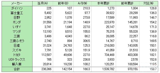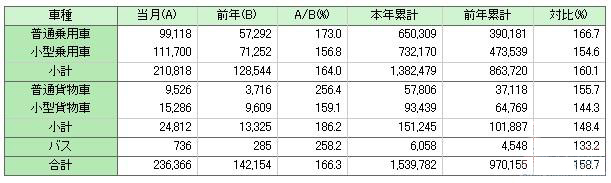 JADA的统计数据显示,不含微型车销量,今年5月份,日本汽车市场上汽车总销量为23.6366万辆,较去年同期增长66.3%,去年同期的销量为14.2154万辆。
