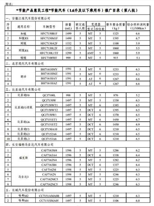 根据相关部门关于“节能产品惠民工程”及“调整节能汽车推广补贴政策”的通知要求,国家发展改革委员会、工业和信息化部和财政部,对各地上报的节能汽车推广申请报告及相关材料进行了审核。现将“节能产品惠民工程”节能汽车推广目录(第八批)予以公告。