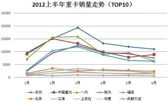 虽然北方奔驰、江淮、上汽红岩依维柯、华菱、大运这五家企业的上半年销量也有所波动,但由于销量基数小,所以波动趋势不明显。