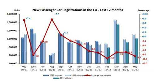 综合外电报道,日前欧盟官方数据表明,欧元区5月份失业率达到主权债务危机以来的最高值,日趋衰微的欧洲车市,可能进一步创下销量新低。