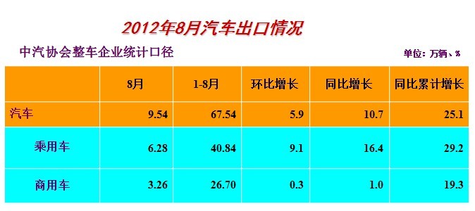 据中国汽车工业协会统计的整车企业出口数据,8月份,国内汽车企业出口量达9.54万辆,环比增长5.9%,同比增长10.7%。