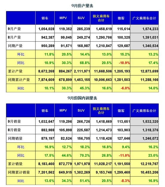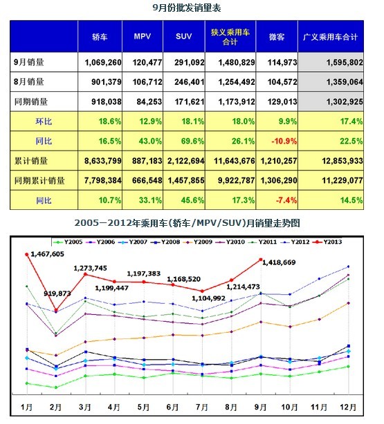 每逢“金9”车市自然会好,从月初到月底市场销量同比和环比均是大幅上涨。由于9月底节能车补贴暂停,抬高了9月份的销量。去年9月份,由于日本搞购岛闹剧,日系合资企业在华销量剧减,今年9月份日系企业销量同比增幅最大,而内资企业销量遭到挤压。