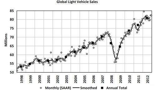 日前,LMC Automotive公司发布报告称,2012年全球轻型车总销量估计值约为8089万辆,按照2012年12月销售速率换算年化销量则达到8231万辆。