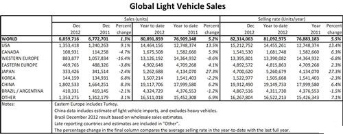 根据报告,2012年12月,全球轻型车销量6859716辆,2011年12月为6772701辆,同比增长1.3%;2012年全年,全球轻型车销量达到80891859辆,对比2011年的76909148辆,同比提高5.2%。