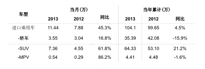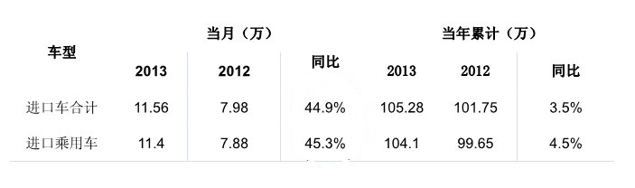 2013年1-11月,国内海关汽车进口量为105.28万辆,同比增长为3.5%,2013年第一次实现正增长,其中,乘用车进口104.1辆,超过百万辆级台阶,同比增长4.5%。