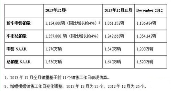 基于2013年12月前11个销售工作日表现,报告预计12月美国市场新车销量为1357800辆,去年12月则为1354142辆。虽然绝对数字仅微增0.3%,但考虑到今年12月只有25个销售工作日,去年为26个,平均每日销售速率将至少同比增长4%,大约为4.3%。