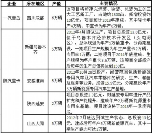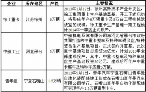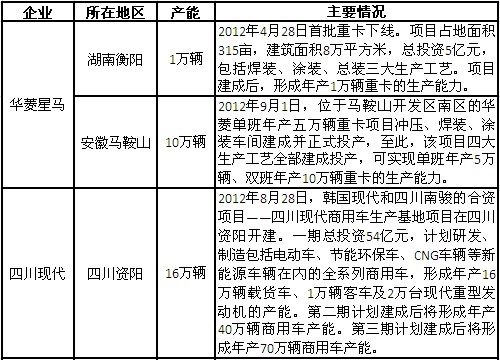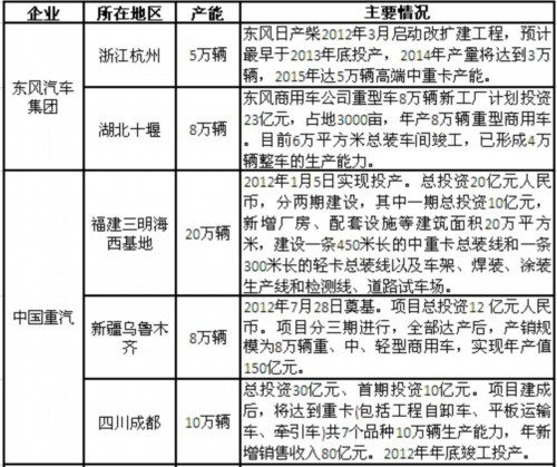 排在第五名的东风汽车集团,其在建和新建成的产能为13万辆。其中,东风商用车公司8万辆重型车新工厂已建成4万辆产能并投产;此外,东风日产柴改扩建项目于2012年3月在杭州启动,最快于2013年底投产,并最终达到5万辆中高端重卡产能。