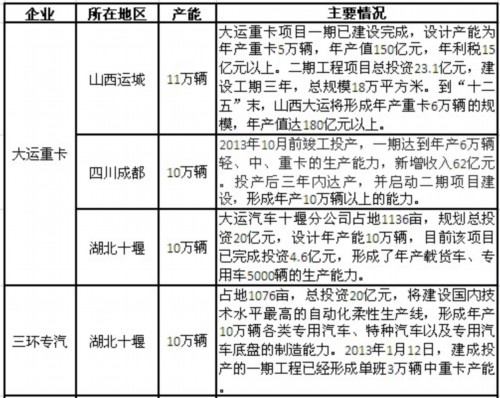 华菱星马的在建和新建成产能为11万辆。另一家计划打造10万辆中重卡产能的,是一直较为低调的湖北三环专汽,其十堰新工业园一期工程已于2013年初完工并正式投产,单班产能可达3万辆。