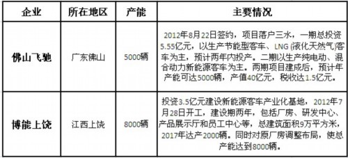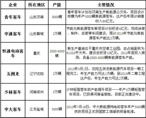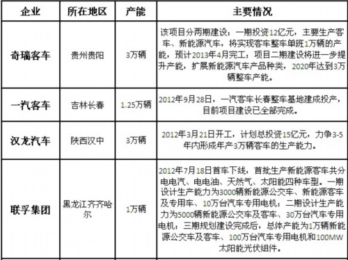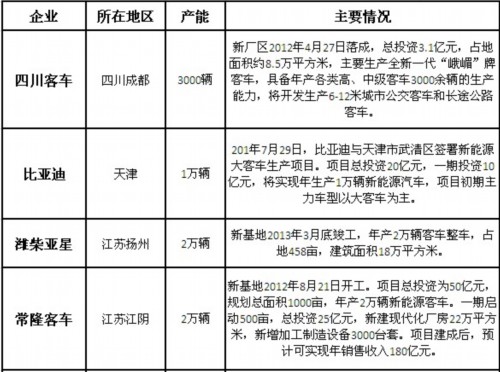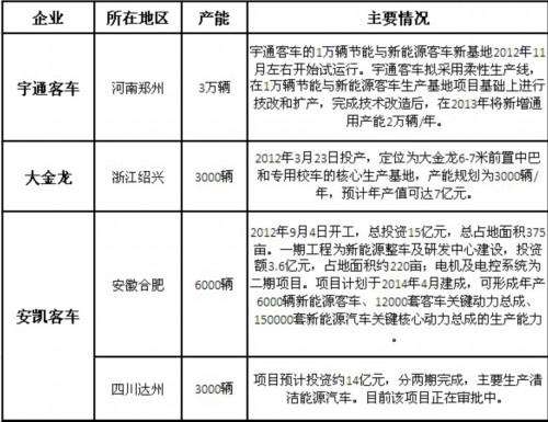 2012年,表现不俗的中通客车,启动了2万辆生产基地的建设,主要生产节能与新能源客车。同样表现不错的安凯客车,也投入两条生产线,分别针对新能源客车市场及清洁能源客车市场,产能共达到9000辆。