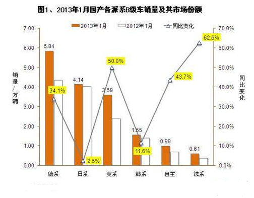 根据盖世汽车网整理的数据,2013年1月中国国产B级车(本文均指非豪华车品牌)销量16.73万辆,同比增长26.3%,增幅低于国产轿车市场平均水平(48.5%)。其中,除日系以外,其他派系销量均实现快速增长。