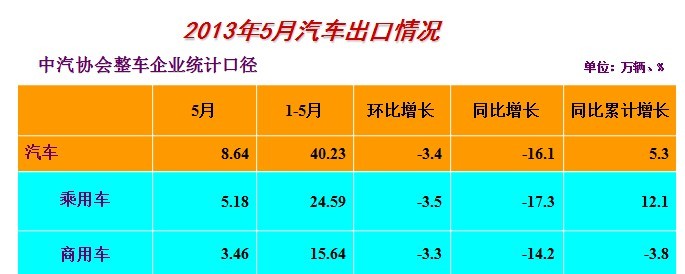 日前,中国汽车工业协会公布的最新数据显示,2013年5月汽车企业出口8.64万辆,比上月下降3.4%,比上年同期下降16.1%。