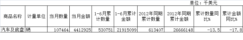 1-6月,国内汽车及底盘的累计进口量和进口金额保持了前4个月的同比大幅下滑态势。其中,进口量同比下滑13.5%,为530751辆;进口额同比下滑17.8%,为219.2亿美元。