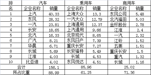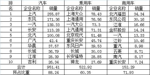 表1 2013年6月分车型前十家生产企业销量排名 单位:万辆、%