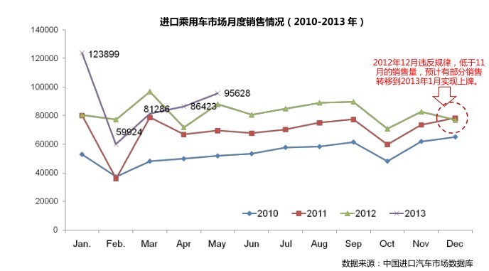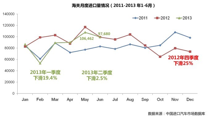 2013年1-5月,进口车市场销售44.7万辆,同比增长8.0%,相比2012年同期市场增长25.1%,出现明显的增速下滑。