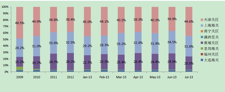 据王存介绍,2013年7月,天津关区份额再次超过四成,上海和深圳关区份额略有下降。