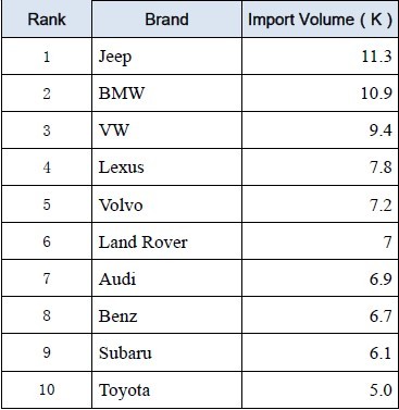 据王存分析,Jeep首登进口量榜首与其最近一段时期的政策调整有关;而奥迪和奔驰的进口量减少则是由于目前库存积压严重;值得注意的是,丰田重回进口榜单前十显示,过去一年中国对日系车的仇视状态正趋于缓和。