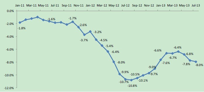 2013年1-7月,累计进口乘用车为62.79万辆,同比增长-6.2%,其中SUV同比增长11.7%,其他两个车型均为负增长,且幅度超过20%。