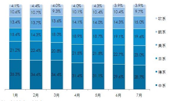 今年以来,自主品牌的市场份额出现了逐月下滑。中汽协公布的统计数据显示,7月份,自主品牌狭义乘用车的市场份额下滑至28.7%,为今年的月度最低值。