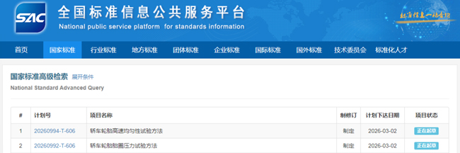 近日,轮胎行业两项团体标准,获批列入2026年推荐性国家标准制订计划。