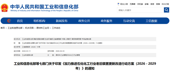 4月3日,国家工业和信息化部等七部门,印发《加力推进石化化工行业老旧装置更新改造行动方案(2026—2029年)》。