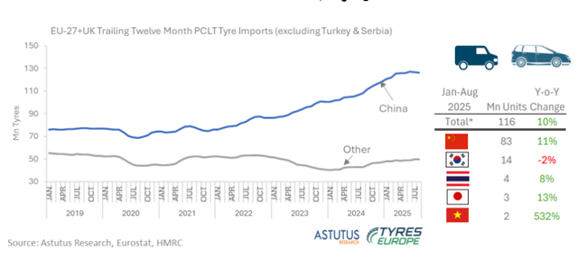 值得注意的是,今年前8个月,欧盟27国及英国轮胎进口量大增。